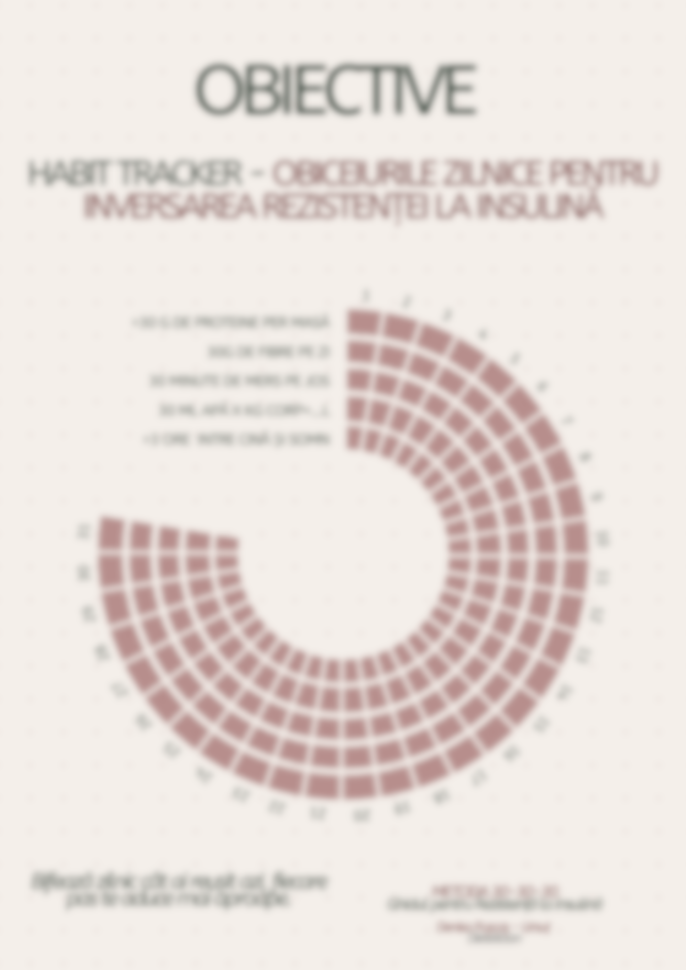 De aceea, în pachetul complet primești un tracker de obiceiuri în care obiectivele esențiale sunt deja stabilite pe baza ghidului: mese regulate, aport de fibre și proteină, mișcare, hidratare și alte comportamente cheie pentru sănătatea metabolică și sensibilitatea la insulină.
